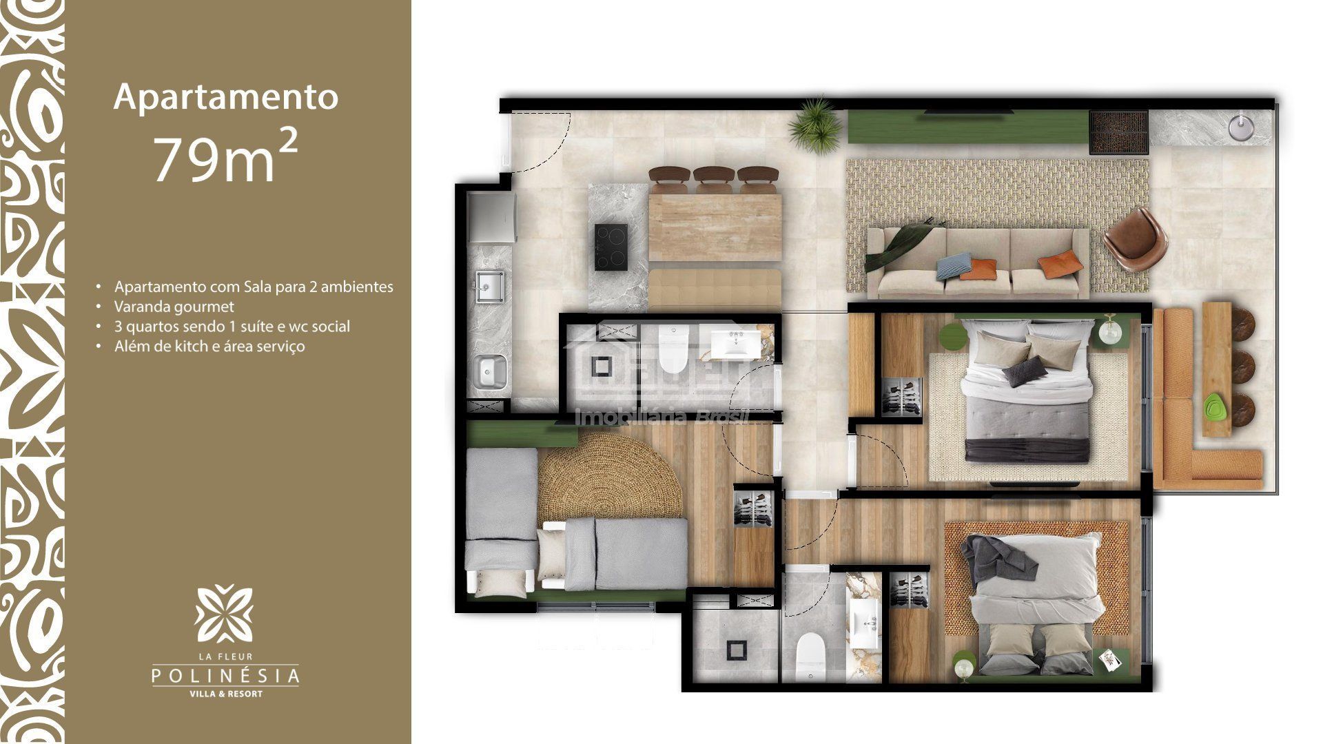 • 79m² – 3 quartos (1 suíte), varanda gourmet e sala para 2 ambientes