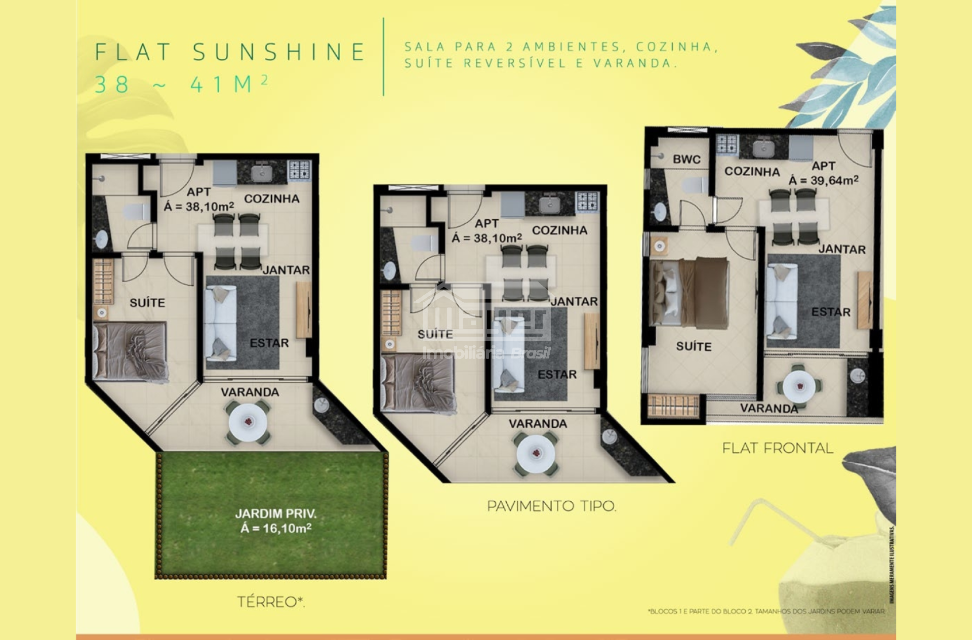 • Apartamentos de 41 m² (1 quarto / suíte reversível), sala e cozinha