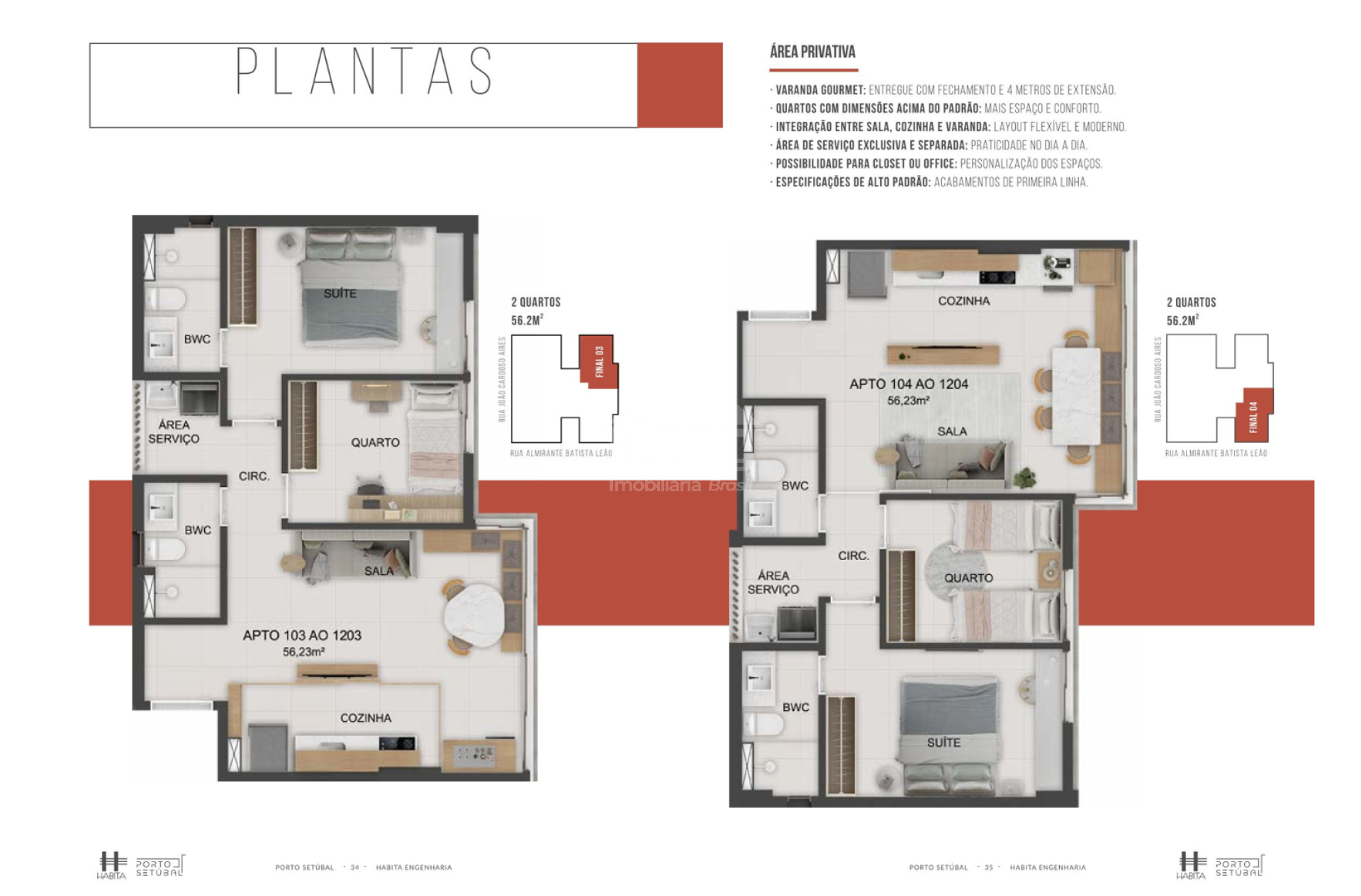 Unidades de 56 m² com dois quartos