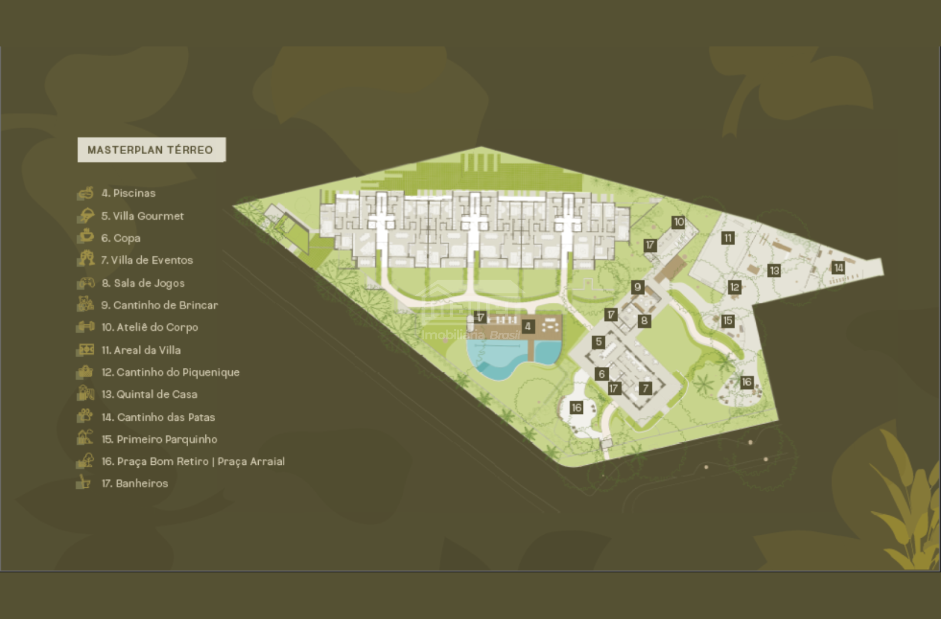 Piscinas, Villa Gourmet, salão de eventos, sala de jogos, brinquedoteca, ateliê do corpo, quintal de casa, praças internas, áreas de piquenique, parquinhos, bicicletário, minimercado e espaços pet.