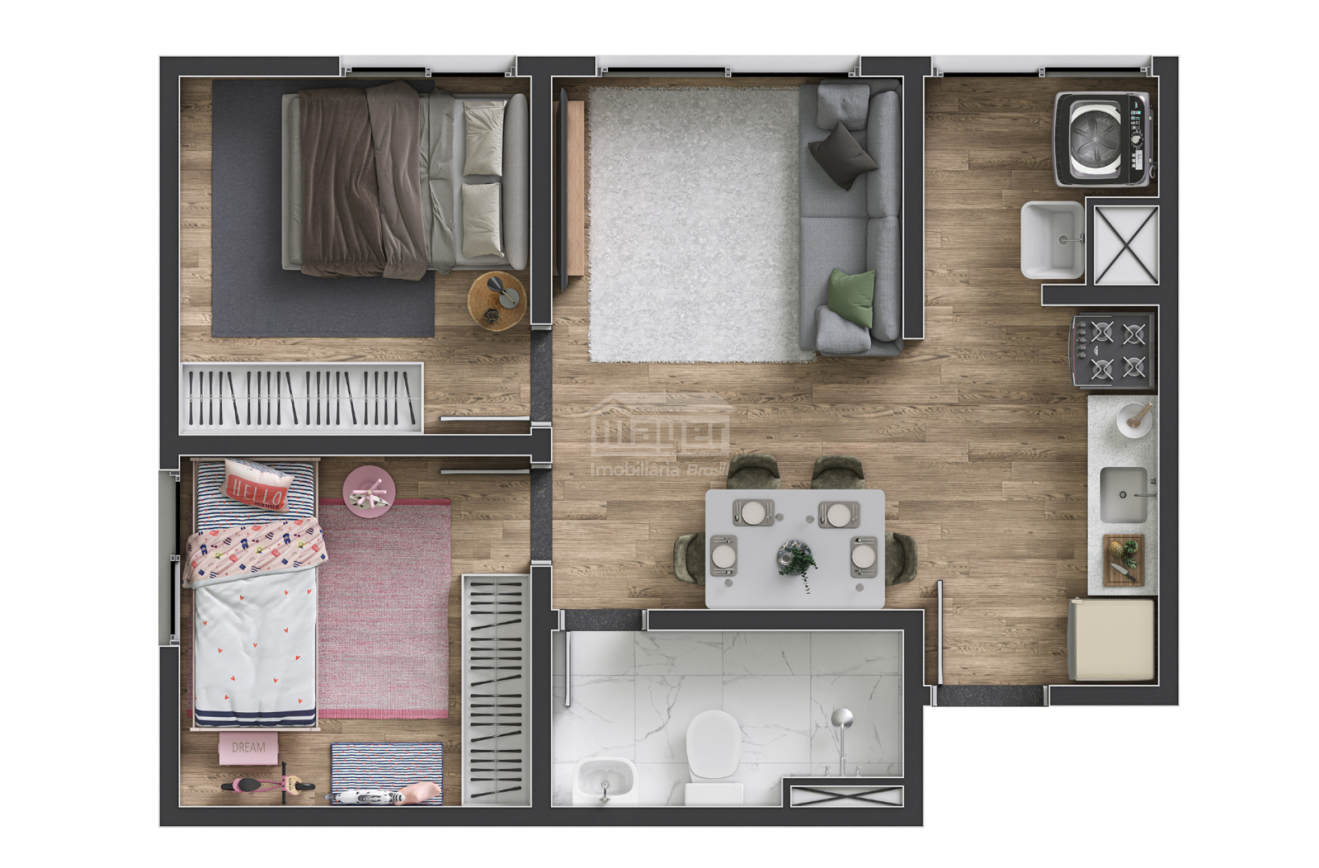 Apartamentos de 33,62 m² e 34,73 m², com acabamento em cerâmica, porta com isolamento acústico, paredes em drywall e soluções sustentáveis que reduzem seus custos mensais.